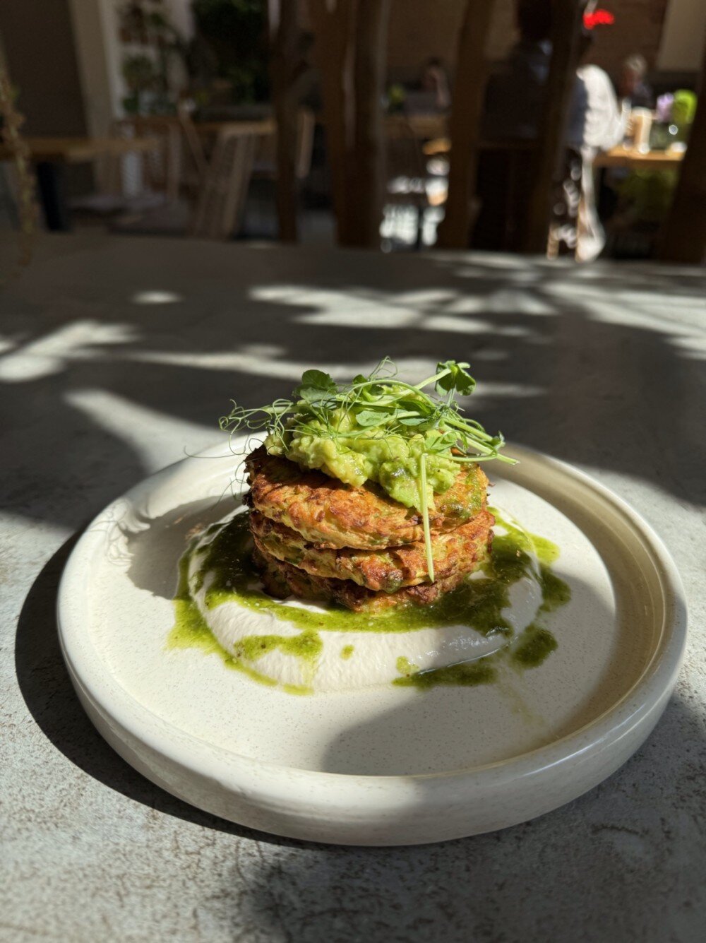 Кабачковые оладьи с авокадо, зелёным маслом и сметаной