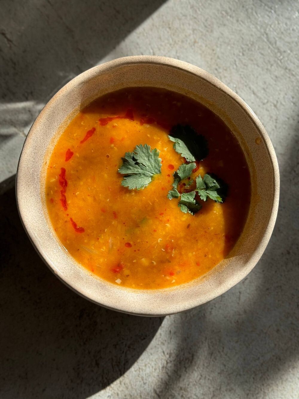 Подаётся с сухариками, чили-маслом и кинзой