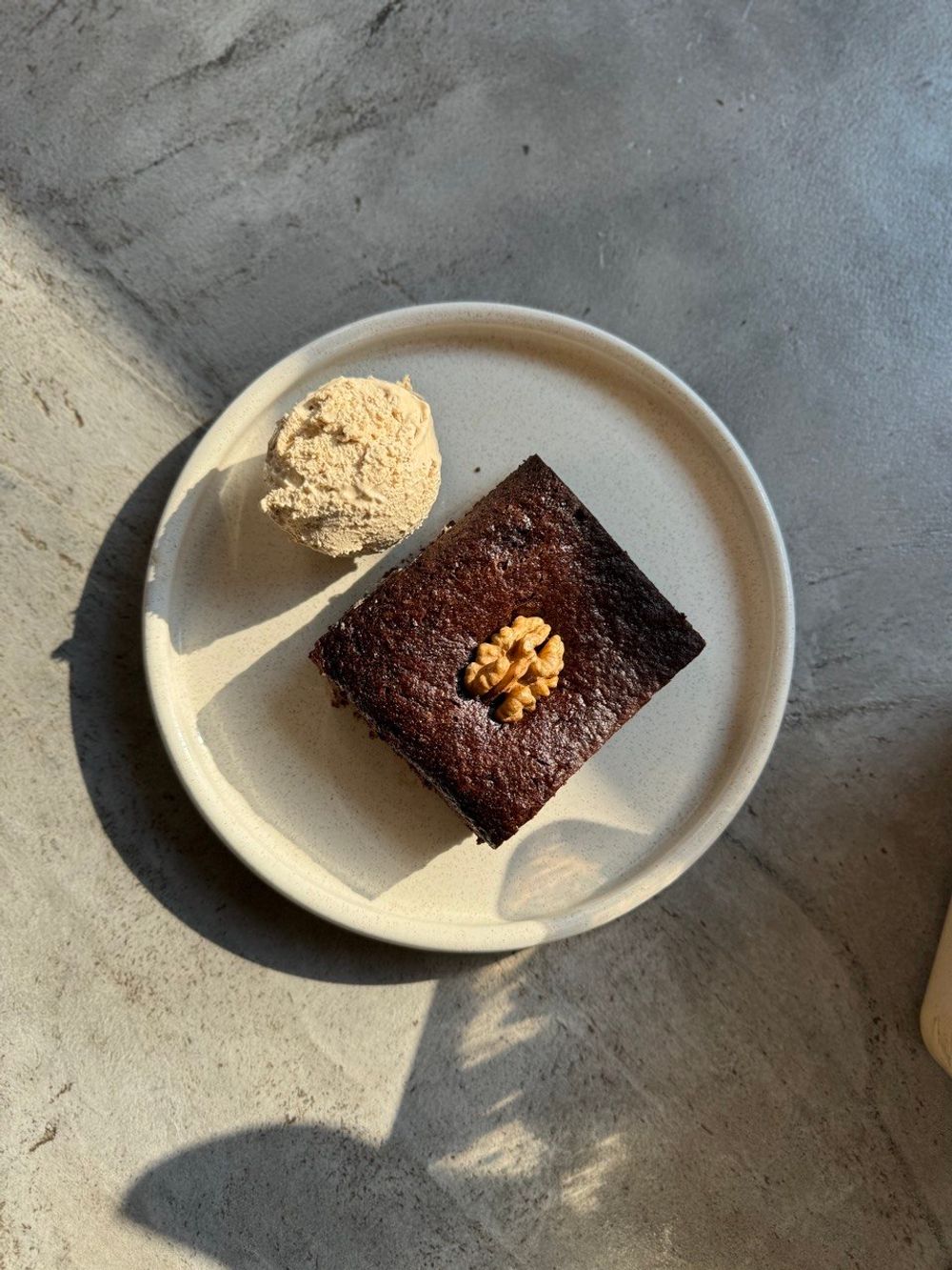 Шоколадное, мягкое, немного тягучее пирожное с шариком домашнего кокосового мороженого. Веган. Без глютена.