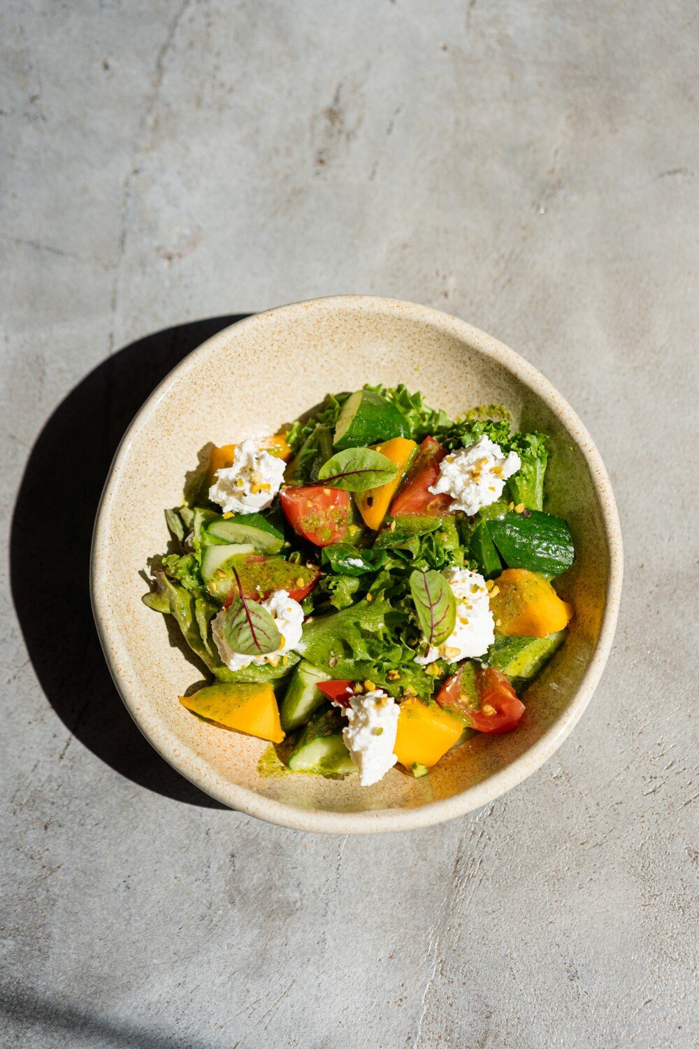 Микс салата, спелые томаты, огурец, свежий манго, песто, фисташки, творожный сыр